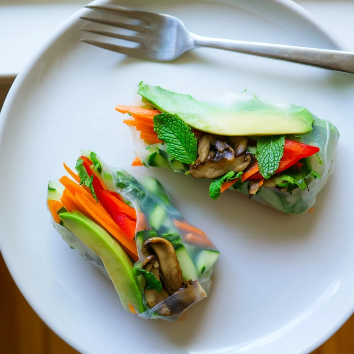 The secret to these spring rolls isn't any single ingredient but how they all work together—the creamy avocado against the crisp vegetables, the warm earthiness of cooked mushrooms beside bright fresh herbs. When you're assembling, try to include a little bit of everything in each roll so every bite hits all those notes at once.