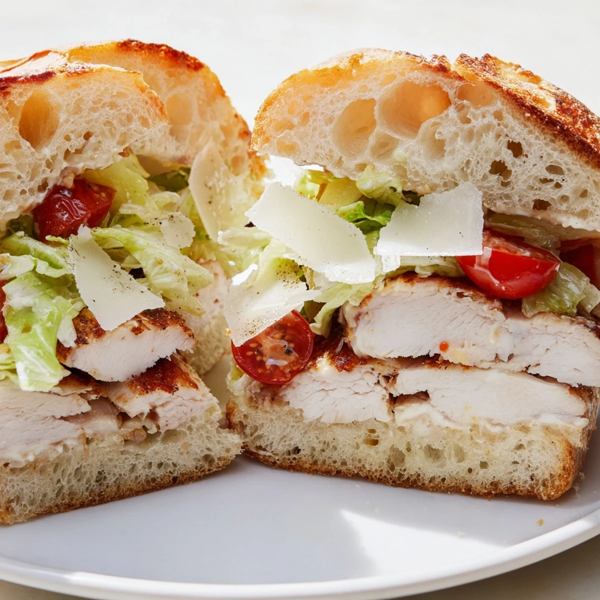 - Spread a generous layer of dressing on both halves of each roll. Layer shredded romaine, sliced chicken, shaved Parmesan, and cherry tomatoes if you have them. Close the sandwiches, slice them in half on the diagonal, and watch the first bite disappear immediately.