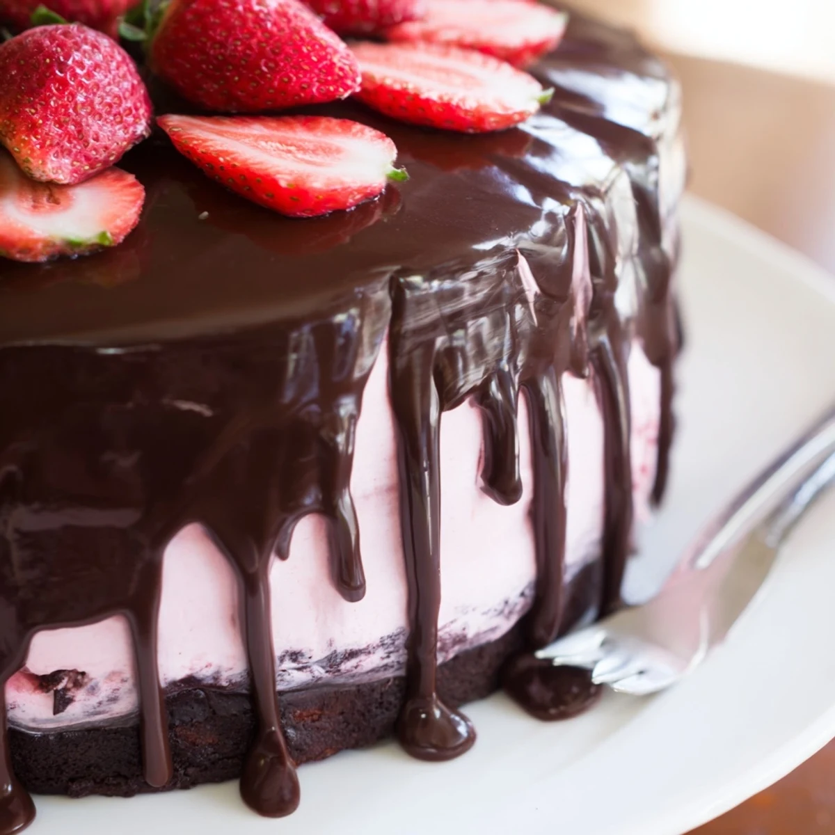 The kitchen was already eighty degrees when I decided to make this cake for my sister's July birthday. My husband walked in mid-assembly, raised an eyebrow at the springform pan sitting in the freezer, and asked if I'd lost my mind baking in a heatwave. But when we sliced into that crisp chocolate shell hours later, revealing the creamy strawberry layers inside, nobody was complaining about the temperature anymore.