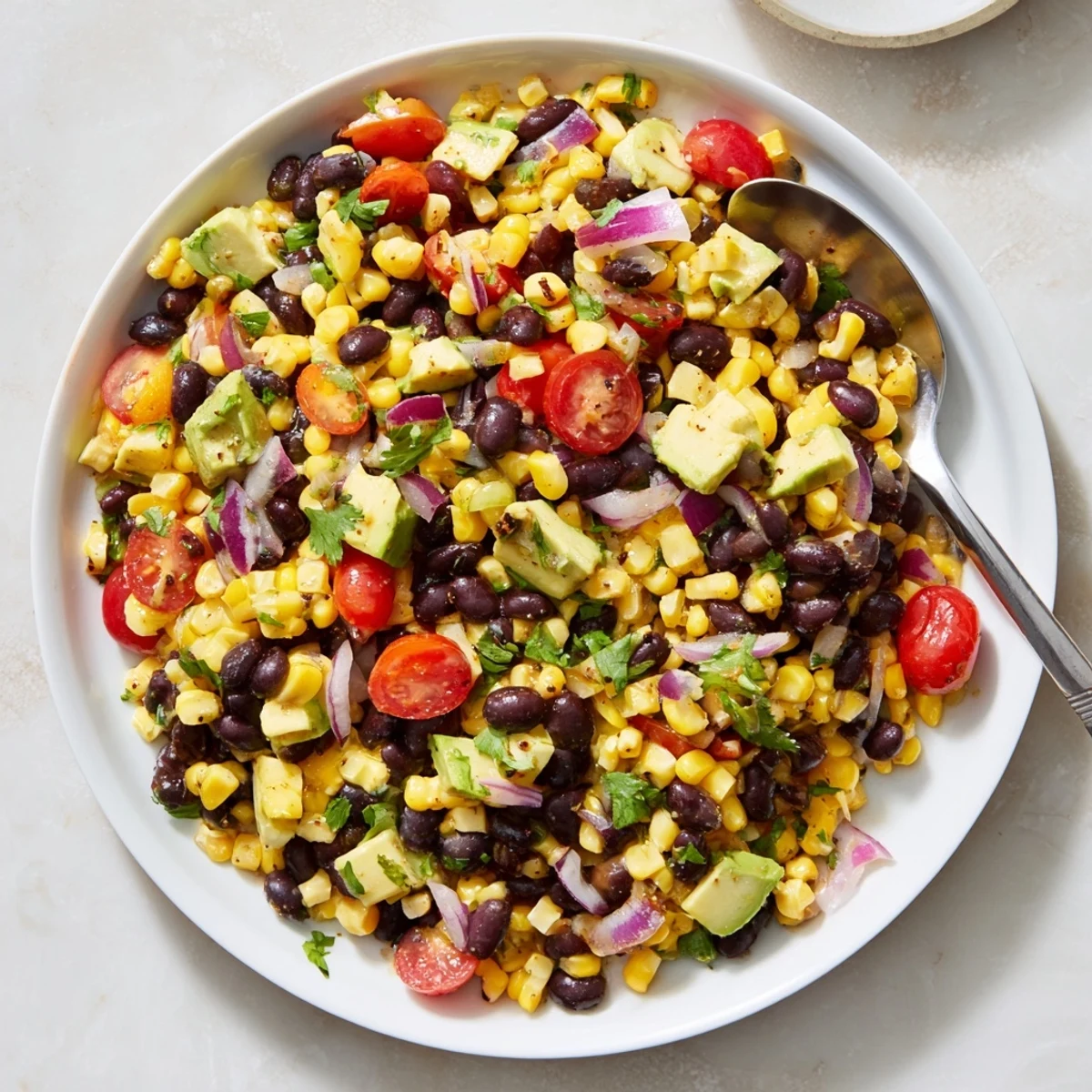 This vibrant dish combines sweet corn kernels with hearty black beans, crisp red bell pepper, cherry tomatoes, and creamy avocado. The zesty lime dressing with cumin and chili powder ties everything together beautifully. Ready in just 25 minutes, it's perfect for summer gatherings, light lunches, or as a colorful side dish for your next taco night.