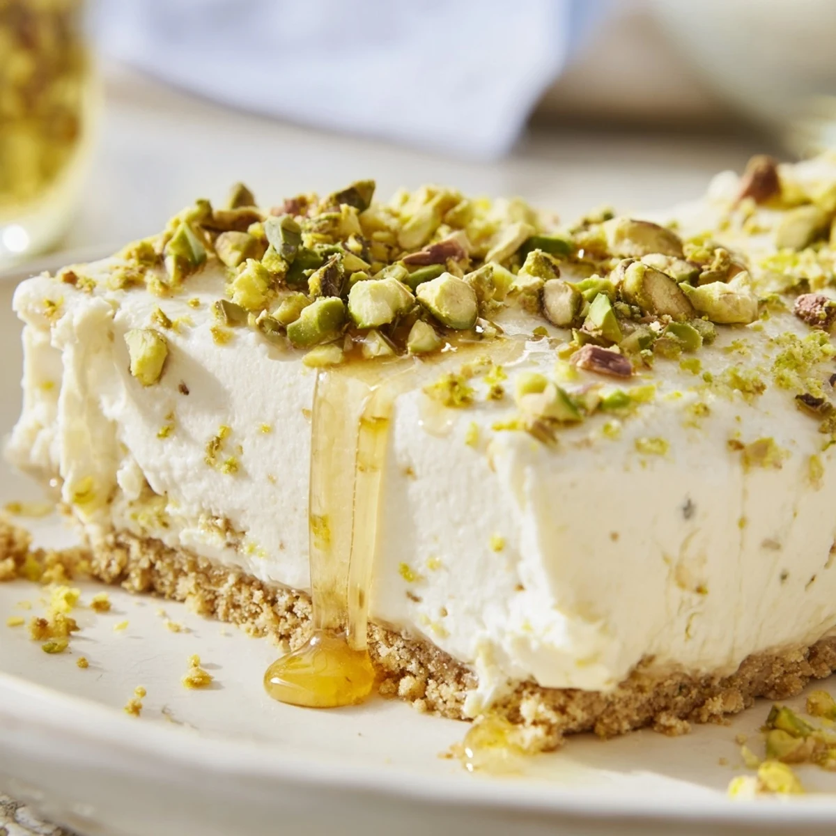 After baking to just-set perfection, the bars chill until firm and are finished with a warm honey drizzle and scattered pistachio pieces for added crunch and visual appeal.