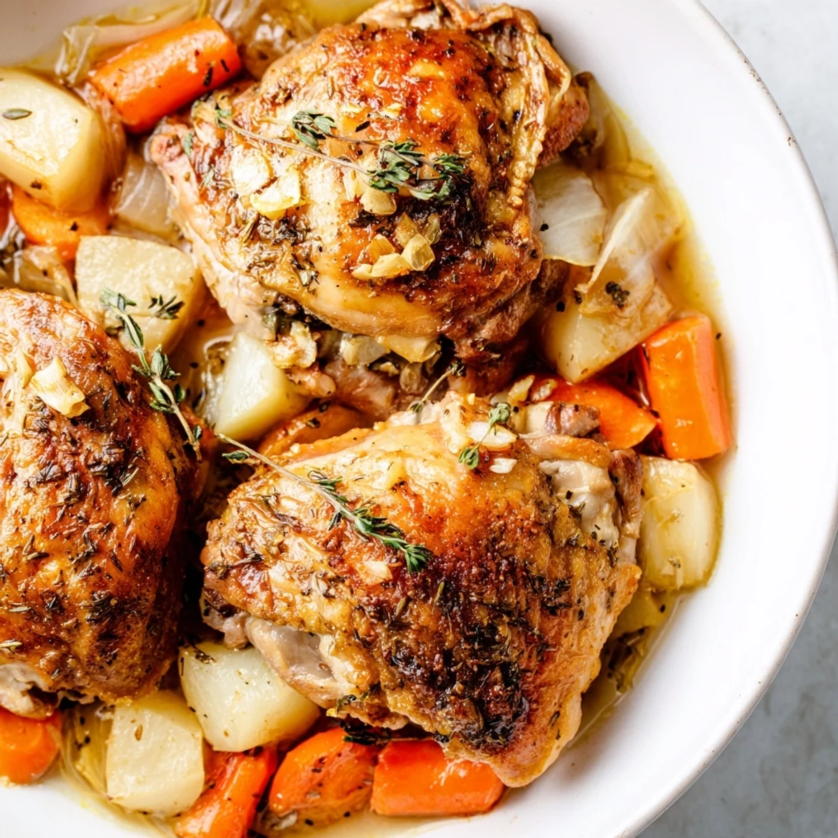 This comforting meal features bone-in chicken thighs slow-cooked alongside carrots, potatoes, onions, and celery in a savory herb broth. The low-and-slow method creates incredibly tender meat and vegetables infused with thyme, rosemary, and paprika.