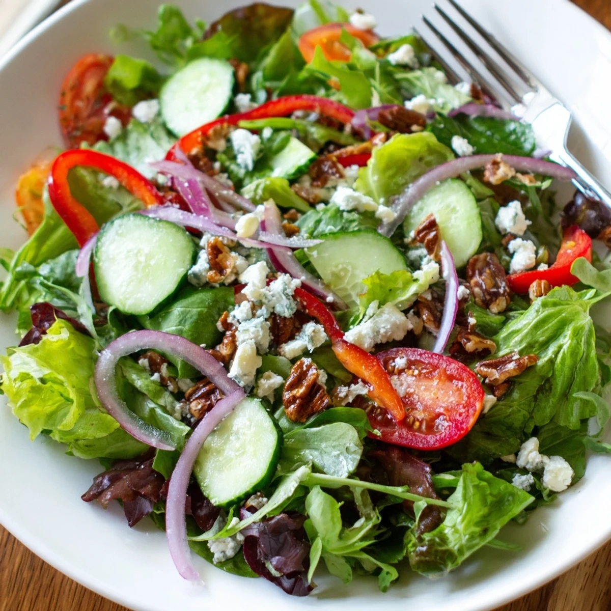 This refreshing bowl combines tender spring mix greens with crisp cucumber, sweet cherry tomatoes, colorful bell pepper, and subtle red onion for perfect texture contrast. The zesty balsamic vinaigrette with Dijon mustard and honey balances tangy and sweet notes beautifully. Optional crumbled feta adds creamy richness, while toasted pecans or walnuts provide satisfying crunch. Everything comes together in just 10 minutes for an effortless dish that works as light starter, side, or quick standalone meal.