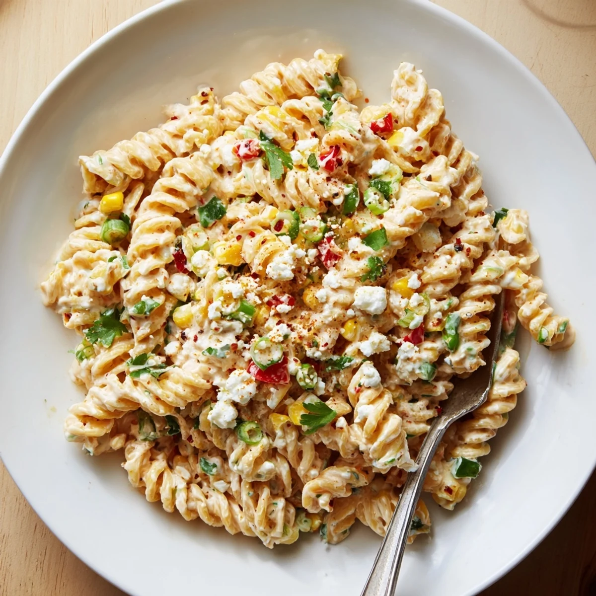 - Add the cooked pasta, corn, red bell pepper, green onion, cilantro, Cotija, and jalapeño if using. Stir gently to coat every nook and cranny with that vibrant dressing.